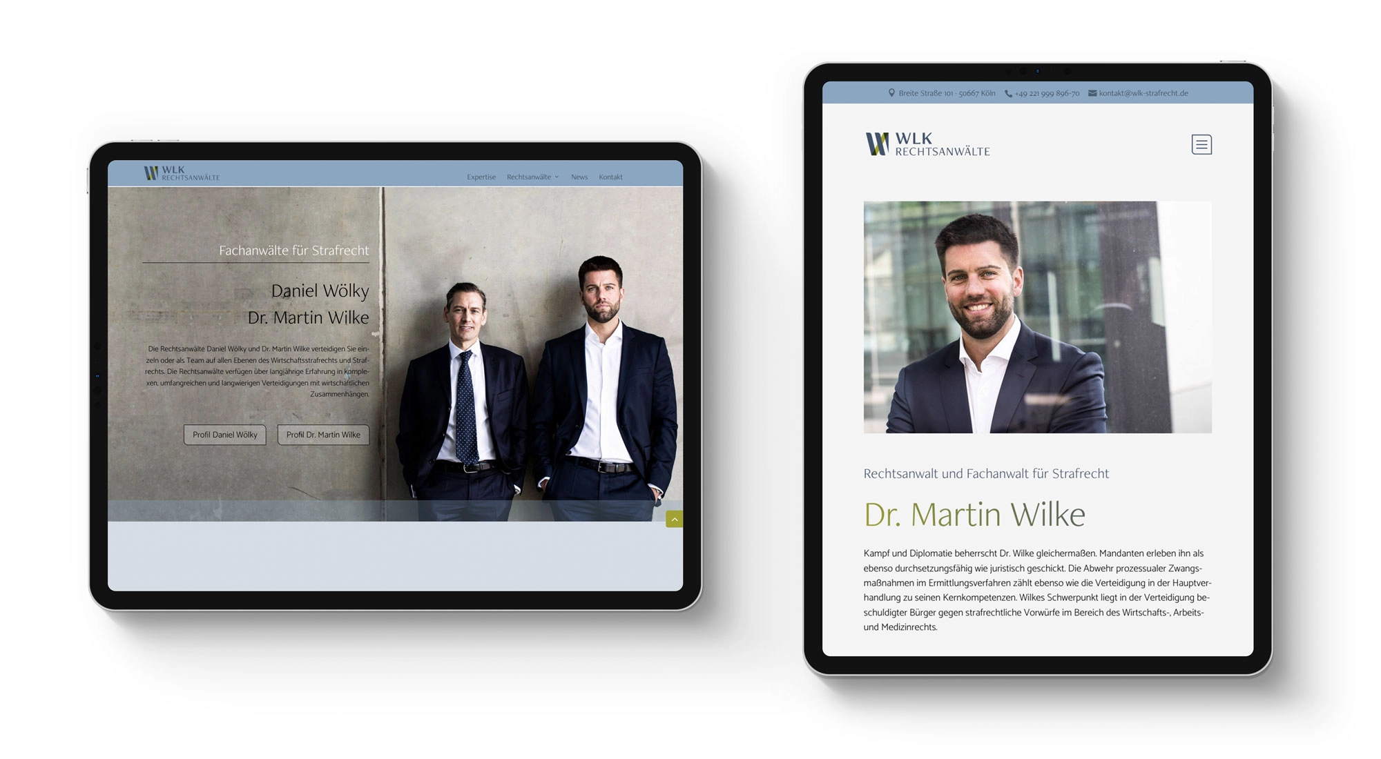 Für die Rechtsanwälte der Kölner Strafrechtskanzlei WLK Rechtsanwälte, die vorwiegend auf das Wirtschaftsstrafrecht spezialisiert ist, habe ich das gesamte Corporate Design entworfen. Neben den üblichen Geschäftsunterlagen wie Briefbogen und Visitenkarten umfasste der Auftrag die Außenbeschriftung der Kanzlei sowie das Design und die Umsetzung der Homepage.